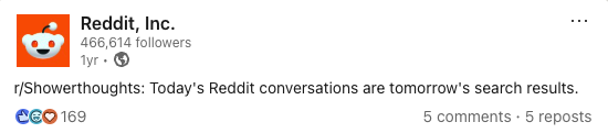 When I took over Reddit’s LinkedIn presence, it had a small following and a distinctly un-Reddit corporate vibe. Over 6+ years, I rebuilt it into one of the most distinctive brand voices on the platform and was an early pioneer in “brands doing LinkedIn right.”