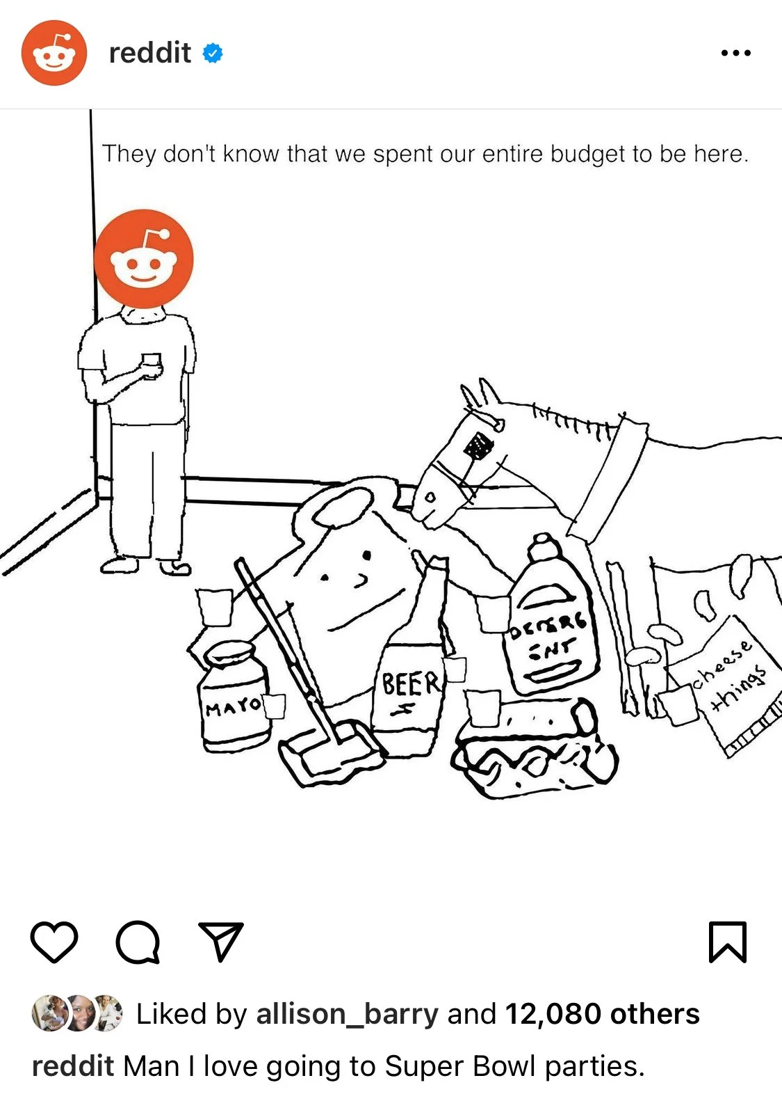 In January 2021, Reddit watched as a subset of its users went toe-to-toe with Wall Street hedge funds, inciting a press and social media frenzy. As site traffic and app downloads surged, we were presented with a unique opportunity to build on this unprecedented momentum. The result was a Super Bowl ad that ran for just five seconds in the U.S.’s nine largest markets. Produced in collaboration with our agency of record, R/GA, the micro spot consisted of a still image with 11 sentences of text. It subtly acknowledged the redditors behind the GameStop stock debacle and positioned our brand as an underdog itself among big-spending Super Bowl advertisers. Both the delivery and message were simple: anything can happen when people come together.
